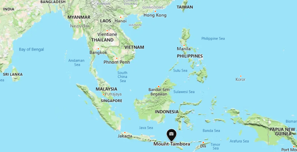 Mapa do Sudeste Asiático com a localização do Monte Tambora, na Indonésia, indicada por um marcador preto. Imagem: Google Maps, 2021